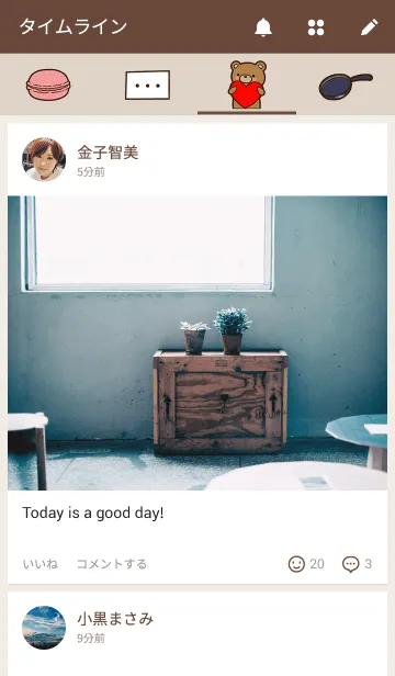 森の中でカフェを営む可愛いくまさんです。落ち着いた茶色の色合いと、母性本能をくすぐるクマさんに癒されてね。マカロンのアイコンなどあってコーヒータイムにぴったり♪