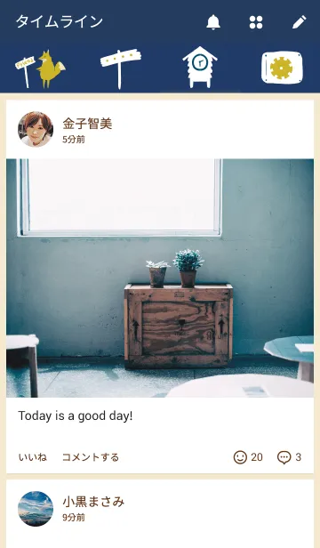 きつねと看板の青色とベージュ色の着せ替えです。