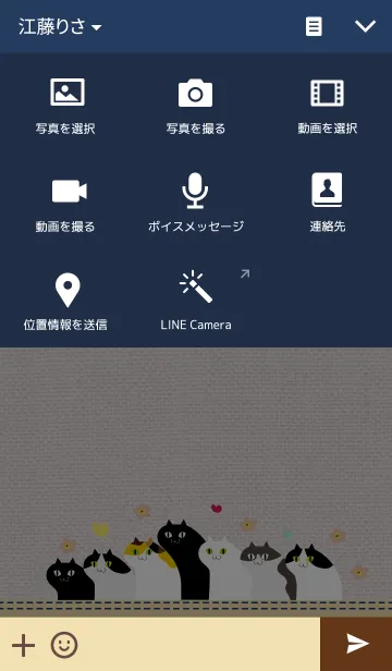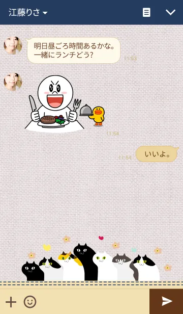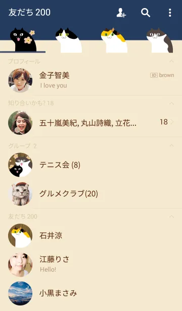 紺色とベージュのベースに猫たちがいっぱい♥トーク画面はキャンバス地の下にネコが集合。落ち着いた雰囲気で可愛すぎない。三毛猫・ハチワレ・白猫・黒猫などなど★