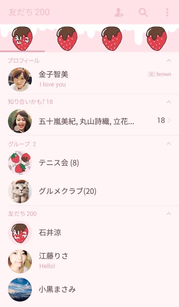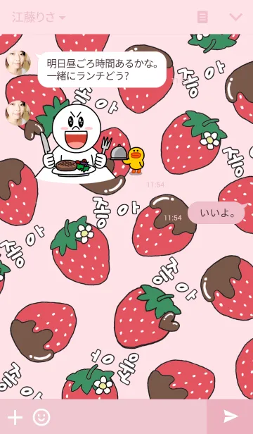 ラブ運up!トーク画面にチョア(好き)といちごがたくさん、おしゃれ可愛いハングルとイチゴちょこ柄の着せかえ。いちごみるくVerもあるのでお友達や家族とペアでもどうぞ♡