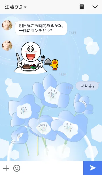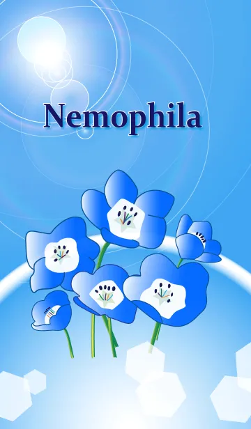 青い花の名前はネモフィラです。花言葉はどこでも成功、可憐、あなたを許すです。自然やフラワーが好きな方に送る大人のキレイなLINE着せかえです。
