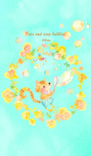 ネコとしゃぼん玉がいっぱい。ネコと黄色いお花のリースが、かわいい着せかえです。しゃぼん玉飛んだ。お空まで飛んでいくといいな。